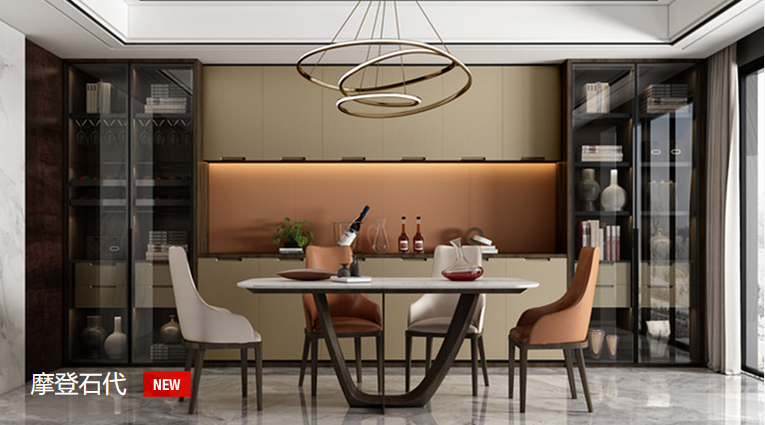 2、岩板门板,用高温烧制天然原材料,形成超大规格新型瓷质材料,是厨房门板的发展趋势,柜门表面用岩板来装饰。硬度非常高,耐冲击耐磨,同时还容易清洁,在轻奢、现代风的家装设计中尤其能凸显其质感。